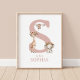 Add a dreamy touch to your nursery with this Letter Initial Jungle Safari wall art. Featuring a monogram S with a watercolor elephant, monkey and giraffe all wearing boho floral crowns, this sweet design is perfect for a baby’s room. Add your little one's name for a special, personalized touch!