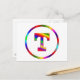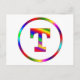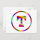 A colorful monogram with the letter T in rainbow colors inside of a rainbow circle. Share your pride of your name with a fun happy initial T.