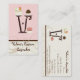 Letter V Monogram Custom Business Cards for your cupcake or other bakery business. Sweet and Contemporary! This business card design features three hand painted cupcakes in chocolate brown and soft pink and cream. The Monogram Letter is in “chocolate” and will appeal sweet lovers everywhere! The background is a soft shell pink with latte colored swirls over a cream crackle finish and a chocolate brown stripe. This design is perfect for your wedding shower, bridal shower or for businesses such as wedding coordinators, event planners, bakeries, bake shops, custom wedding cake designers, specialty cupcake services and more. Every letter of the alphabet is available, if you don't see what you want just email us!