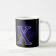 Mok met de letter X. (bijvoorbeeld je initiaal) Leuk als je naam met de X begint of die van een ander. Achter de letter is een raster en mysterieuze wolken met een licht die erop schijnt. De letter X is gevuld met een plaid patroon en een grijze rand erom heen. kleuren blauw, paars, geel en zwart.