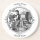 Coaster with vinatge image of a letterpress printer working on a printing press.