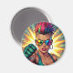Pop art comic book style woman in sunglasses with rainbow reflection with undercut giving an upper cut pow punch rainbow lgbtqia+ sunglasses magnet.
