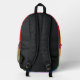 All-over print backpack with an image of an LGBT (lesbian, gay, bisexual, transgender) pride flag and a rainbow; pink, white, and orange design on a black background, with a customizable text template for your own name or message