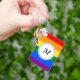 Keychain with the LGBT flag with rainbow stripes of red, orange, yellow, green, blue, and purple, LGBTQ pride design with a custom text field for your initial