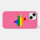 Phone case for Apple iPhone 14 with LGBT (lesbian, gay, bisexual, and transgender) rainbow stripes map of the American state of Texas, gay pride flag design on pink background, by pinkbrickroad