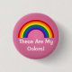 Round Button with LGBT (lesbian, gay, bisexual, and transgender people) rainbow stripes, gay pride flag design on pink background, "These Are My Colors" template text, by pinkbrickroad