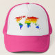 Trucker hat with LGBT (lesbian, gay, bisexual, and transgender people) rainbow stipes map of world, rainbow pride design, by pinkbrickroad
