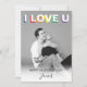 Surprize your boyfriend, husband, partner or secret crush with this cute, simplistic, black and white photo valentines card. This LGBT card features the text 'I LOVE U' in white text with a rainbow shadow, and signed with your name. The font styles, size and color can be changed by clicking on the customize further link after personalizing.