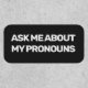LGBTQ gender fluid pride patch featuring the customizable wording "Ask me about my pronouns" in white all caps lettering, on a black background.