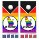 Cornhole Set with cat in rainbow flag color on rainbow flag background.