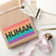 We're all HUMAN. LGBTQ pride patch featuring the customizable wording "human" in black all caps lettering, on a rainbow background.