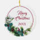 On the front of this Holiday ornament is an image of an adorable Lhasa Apso Dog peeking out of a holly and evergreen bough. Red berries and pine cones decorate the holly and pine sprigs. The image is placed on a white circle within a thin red line circle. The back of the ornament has the same evergreen bough wreath and circle with your custom text in red.