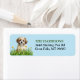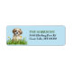 The left side of these return address labels feature an image of an adorable Lhasa Apso puppy sitting in a garden of yellow spring daffodil flowers and green foliage. At the right is your custom text in green and black. Everything is placed on a light blue background.