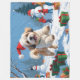 A fluffy Lhasa Apso runs happily through the snowy landscape, wearing a festive red Christmas hat. This cheerful winter scene showcases the breed’s long flowing coat, loyal nature, and playful charm while capturing the warmth and magic of the holiday season. A delightful design full of festive spirit.