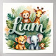 Beautiful nursery decor featuring charming baby safari animals and tropical leaves with the name Liam prominently displayed. Creates a warm, adventurous atmosphere perfect for any child's room. High-quality print ready for framing. Custom names available - message me for details!
