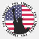 This patriotic design features a silhouette of the Statue of Liberty on circular flag background. Text surrounds reading "Liberty USA." Perfect for the 4th of July or anytime!