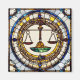 A stained glass style portrait of balanced scales