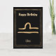 Send a personalized Happy Birthday greeting card to your favorite Libra with this stylized hammered gold Libra the Scales astrology zodiac star sign in a gold double line frame on a black background. The Happy Birthday and Zodiac sign text on the front of the card can be personalized if you have another greeting in mind. Inside the card you can add the name of the Birthday girl or boy above the text that says: You are going to have a terrific birthday, it's written in the stars. A fun personalized card for someone born under the star sign of Libra.