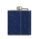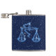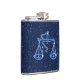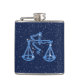 Flask in the zodiac symbol for Libra in soft silver blue, overlaid with the stars of the constellation, against a starry sky background of deep midnight blue