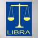 This awesome poster features a digital art image of a pair of golden colored weighing scales with the word Libra underneath in gold text. A fun design for people celebrating a Birthday born between September 23 and October 22 under the star sign of Libra.
