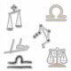 Libra is represented by the scales of justice in a custom cut vinyl sticker page with six different images, including line ink drawings, symbols in black and gold, a black constellation of stars, and Libra text in a fabulous black handwritten font.