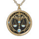 A gift for Libra: a beautiful and intricate personalized necklace, depicting gold-sculpted scales with opal accents. The Libra birth sign adorns the gems. The word "Libra" can be personalized or kept as-is.