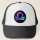 Sporty Libra mesh trucker's hat, blue purple magenta libra zodiac sign on black circle crest. Other colors of hat are also available. You can customize this design if desired (click the "customize" button below the product image) to add text, move or resize images, resize or delete background, etc. Happy blessings from Happy Wishing Well dot com.