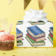 Wrapping paper features an original education-themed marker illustration of a stack of leather-bound library books. Perfect for your favorite teacher or school librarian!