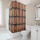 Here is a shower curtain featuring shelves of colorful books. They form an interesting abstract geometrical pattern in colors of green, yellow, red, blue, black and pink.