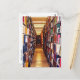 This postcard takes you on a walk down a long aisle of books in the stacks of a huge library. The bright lighting reveals book spines in a kaleidoscope of colors: red, green, blue, black, white, gold, brown, purple. The symmetrical angle creates a geometric design that seems to lead to infinity. The reflections on the freshly waxed floor contribute to the overall pattern.
