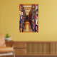 This poster takes you on a walk down a long aisle of books in the stacks of a huge library. The bright lighting reveals book spines in a kaleidoscope of colors: red, green, blue, black, white, gold, brown, purple. The symmetrical angle creates a geometric abstract design that seems to lead to infinity. The reflections on the freshly waxed floor contribute to the overall pattern.