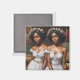 Magnet features portrait artwork of beautiful brown-skinned twin sisters wearing floral crowns of pink flowers and white dresses as they pose in the library.