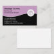 Eye catching licensed massage therapist business card template in purple, black, and white with unique massage emblem and modern design layout you can customize online. Designed for a masseuse, sports physical therapist or day spa.