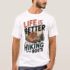 This white garment features the adventurous text "LIFE IS BETTER in Hiking Boots" in bold and cursive fonts. An illustration of sturdy brown hiking boots is set against a scenic backdrop of mountains and pine trees, suggesting a love for outdoor exploration and nature. Perfect for hikers and adventurers.