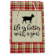 Fun design features goat silhouette with "life is better with a goat" text in modern script and maroon/tan plaid border