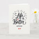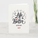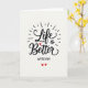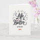 This greeting card centers on the message “Life is Better With You” set on a soft, pale background that keeps the focus on love. The words “Life” and “Better” are written large in smooth, flowing black lettering across the middle. A small red heart takes the place of the dot over the “i” in “Life,” adding a sweet romantic touch ❤️. Thin lines spread outward around the main words like gentle rays, giving the design a light, happy feel. The smaller words “is Better” sit neatly within the larger lettering, tying the phrase together. Near the bottom, “WITH YOU” appears in simple all-caps black letters, and two tiny red hearts sit underneath 💘.