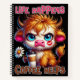 A funny and sarcastic design showcases a cute highland cow sitting with a beautiful white daisy and a to-go coffee cup. The cow, with big blue eyes and a serious expression, sports a lipstick kiss on his cheek and vibrant orange-and-white fur. The colorful text reads, "Life happens, coffee helps." This design is available on various products, making perfect gifts for coffee lovers.