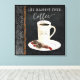 "Life Happens Over Coffee," Life Happens Over Coffee Cafe Personalized Coffee business, shop or cafe Canvas Art Print. Coordinating business identity coffee shop or cafe Chalkboard and watercolor artwork with watercolor white pottery Latte mug personalized with your logo or business name. Script typography inspirational text painted and graphically designed by Audrey Jeanne Roberts, Copyright.