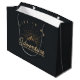 Large gift bag with a gold colored illustration on a black-gray background. Designed with an illustration of a mountain with the suns rays shining outward from behind. Typography says: Life is an Adventure explore dream discover.