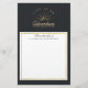 Personalized "From the desk of" stationery paper with a gold colored illustration on a black-gray background. Designed with an illustration of a mountain with the suns rays shining outward from behind. Typography says: Life is an Adventure explore dream discover. A white square to write inside which has a thin faux-gold border.