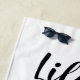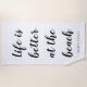 Life is better at the beach black and white script Beach Towel. Stylish hand lettered brush script typography print for humorous quote. Unique Birthday gift ideas for men, women and kids. White or custom background color. Large size towel for beach, boat or pool. Create your own extra large towels for best friends, retiree, retired person, pensioner, family, husband, wife, co worker, colleague, boss, employee, mom, dad, sister, brother, aunt, uncle, grandpa, grandma, manager, teacher, nurse, coach, office worker, swimmer, traveler, son, daughter, teenager, vacationer, wedding couple, newlyweds, bride and groom, Mr and Mrs, honeymooners etc. Big letter text template. Elegant hand lettering calligraphy with pretty swirly letters. Personalize with his or her name at the bottom.