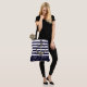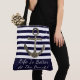 This weekender tote bag is perfect for a weekend on the beach or for the jet-setter who loves to travel to new tropical locations and relax on the beach. The design features nautical blue and white stripes with a vibrant anchor. The text "Life is Better At the Beach" is written in script on the bottom of the bag.