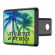 Life is better at the beach palm tree photo car trailer hitch cover. Tropical sunset design with custom text for name, location or quote. Upload your own picture optionally.