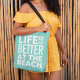 Our summery turquoise aqua tote bag features "Life is Better at the Beach" in modern white block typography, sized up for a perfect summer statement.