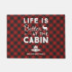 This rustic family cabin doormat will welcome family and friends to your cabin. The design features the phrase "Life is Better at the Cabin" with accents of an arrow, deer and forest pine trees. The background in a red and black buffalo check plaid framed by rustic wood. Personalize with your family name and year established.