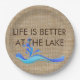 'Life is Better at the Lake' text on burlap-image paper plates with a playful image of water splashing.