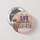 A button with a rustic country design. A trendy old rusting milk can. Wheat and faded red poppies in the background set against a faint wood panel. Wood is just an image, not real. Text says Life is better in the country.