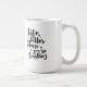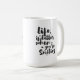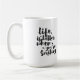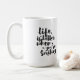 Inspirational mug displaying the phrase "Life is better when you're Smiling" in black brush script with an organic ink texture to achieve an authentic, hand lettered look.