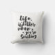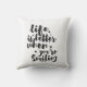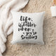 Inspirational pillow displaying the phrase "Life is better when you're Smiling" in black brush script with an organic ink texture to achieve an authentic, hand lettered look. Designed to look great on all square sizes. Please do check if the image needs to be repositioned or resized after changing the pillow size.