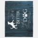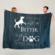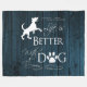 Stay cozy on chilly fall evenings with a Life is better with a Dog Fleece Blanket. Blanket design features text that says "Life is better with a Dog." with a paw print and dog silhouette embellishment against a deep blue rustic wooden background. Additional gift items available with this design as well.